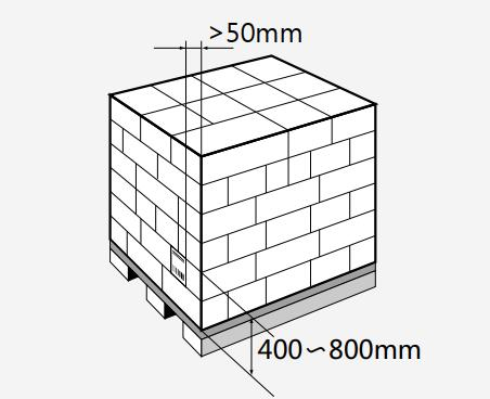 高度高于1m的物流單元:托盤和其他高度超過1m的物流單元,標簽應位于距離物流單元底部或托盤表面400mm至800mm的位置,標簽與物流單元垂直底部的邊線的距離應不小于50mm,如下圖所示。